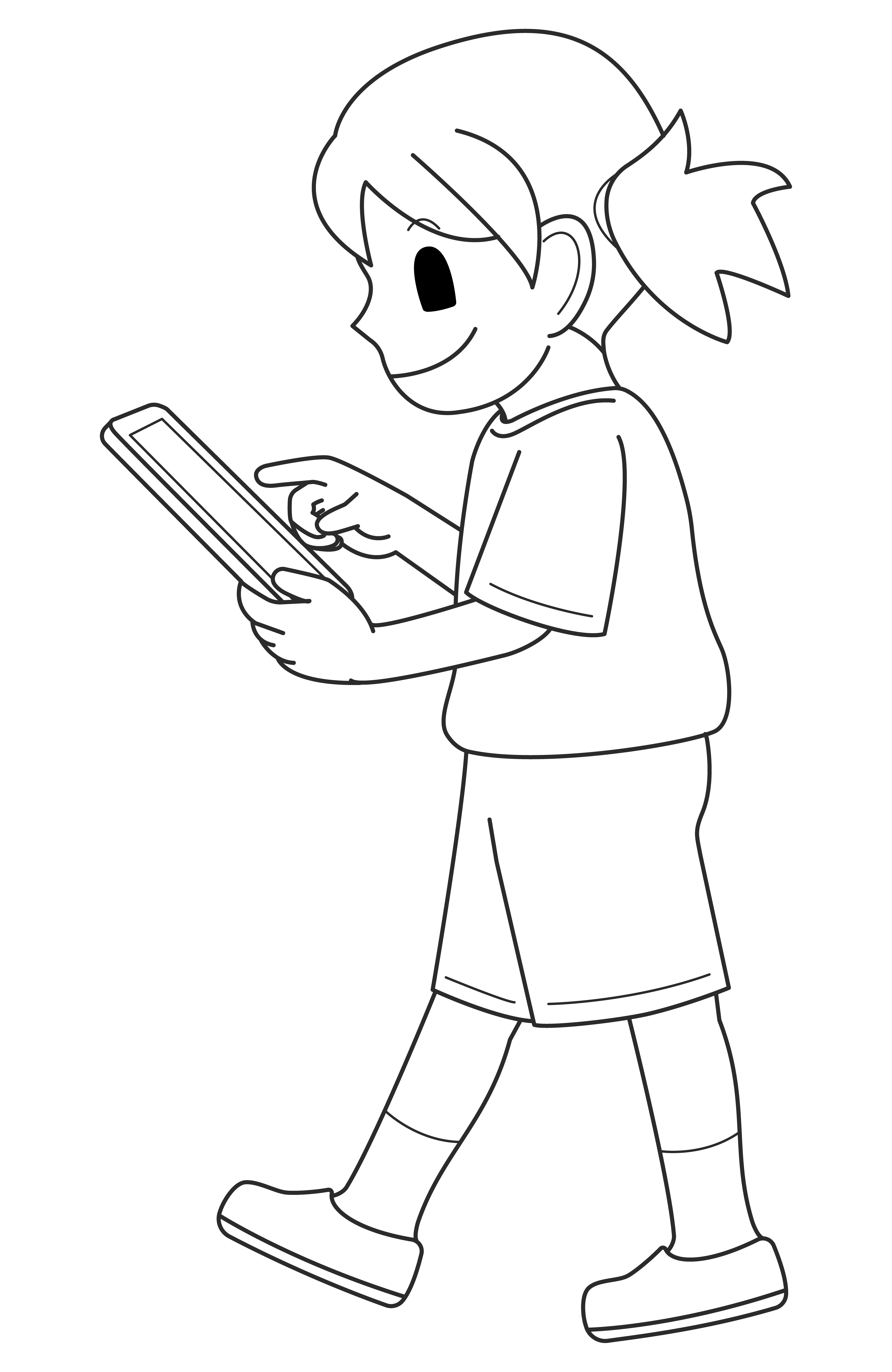 学校でのタブレット利用ルール。「歩きながらタブレットを使ってはいけません」を表す女の子のフリーイラスト素材です。
